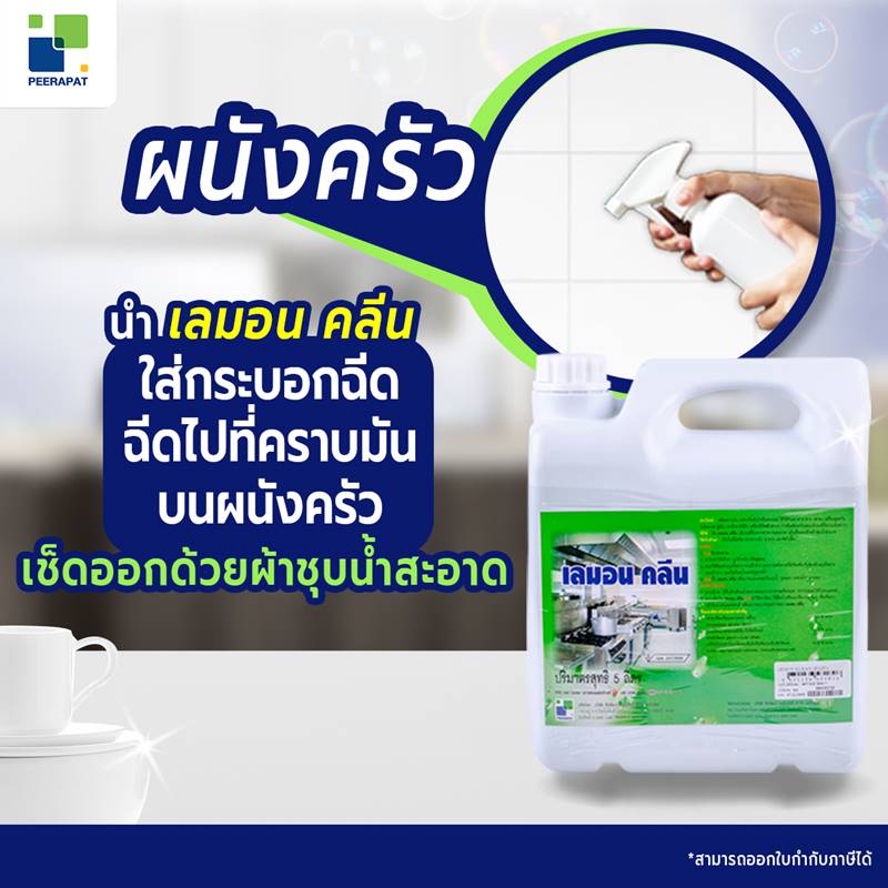 นำ เลมอน คลีน ใส่กระบอกฉีด แล้วฉีดไปที่คราบมันบนผนังครัวให้เปียก จากนั้นเช็ดออกด้วยผ้าชุบน้ำสะอาดไปในทิศทางเดียวกัน
