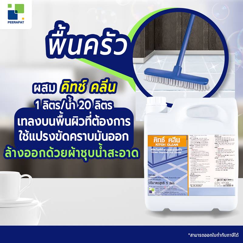 ผสม คิทช์ คลีน ในสัดส่วน 1 ลิตรต่อน้ำ 20 ลิตร เทลงบนพื้นผิวที่ต้องการ แล้วใช้แปรงขัดคราบมันออก จากนั้นล้างออกด้วยน้ำสะอาด
