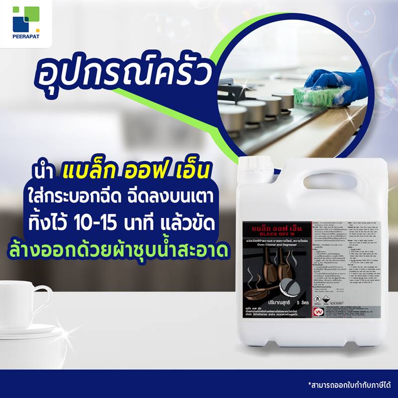 นำ แบล็ก ออฟ เอ็น ใส่กระบอกฉีด ฉีดลงบนพื้นผิวที่ต้องการ ทิ้งไว้ 10-15 นาที แล้วขัดและล้างออกด้วยน้ำสะอาด