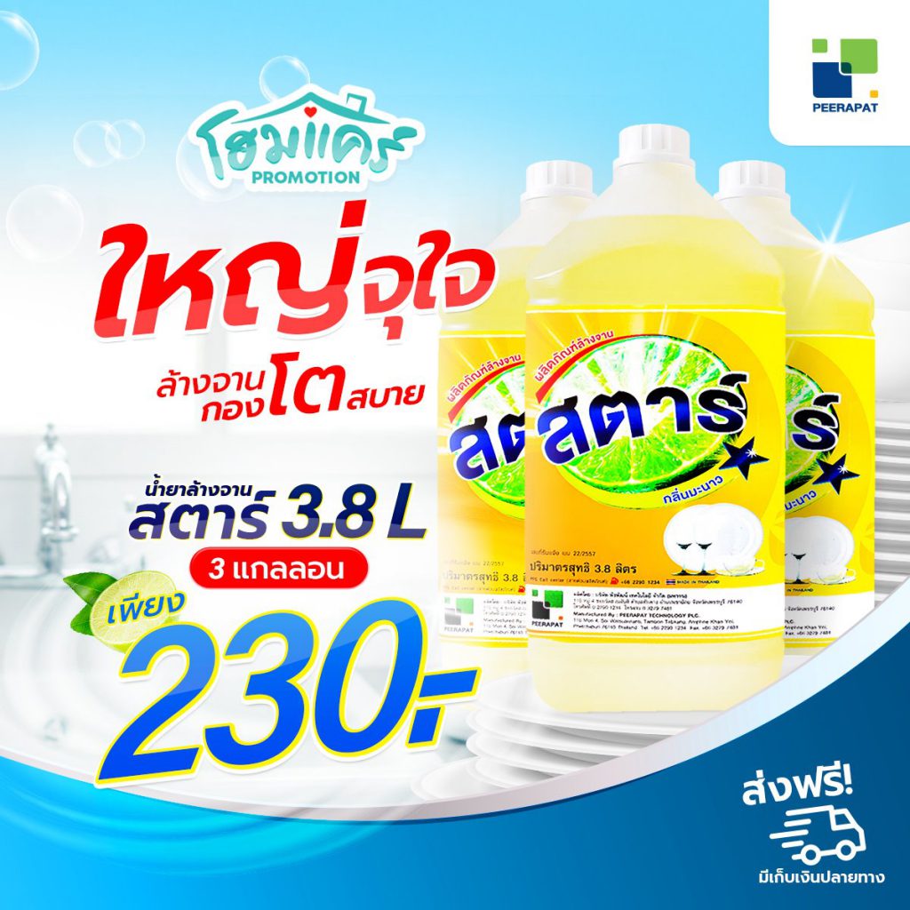 ซื้อน้ำยาล้างจานยกแกลลอนคุ้มกว่าเยอะ ลองนี่! น้ำยาล้างจานสตาร์ ขนาด 3.8 ลิตร ภาชนะสะอาด ล้างสิ่งสกปรกออกหมด ขจัดคราบมันและเศษอาหารได้อยู่หมัด ล้างออกง่าย ประหยัดน้ำ ไม่เปลืองแรง สูตรถนอมมือ ไม่ทำให้มือแห้ง ลอก คัน หอมกลิ่นมะนาว ไร้กลิ่นคาวติดภาชนะ โปรปังสุดต๊าช ลดแรงเกินต้านมาก ซื้อ 3 แกลลอน เพียง 230 บาท เท่านั้น ซื้อครบทุก 150 บาท รับสิทธิ์แลกซื้อ 1 สิทธิ์ กลุ่มสินค้าแลกซื้อโดนใจ ผงซักฟอกกรีนแว็กส์ 1 ถุงขนาด 1,000 กรัม แลกซื้อ 39 บาท น้ำยาปรับผ้านุ่มโรสเพอร์ฟูม 1 ถุงขนาด 375 มล. แลกซื้อ 29 บาท น้ำยาซักผ้าเอ็นจอย 1 ถุงขนาด 500 มล. …