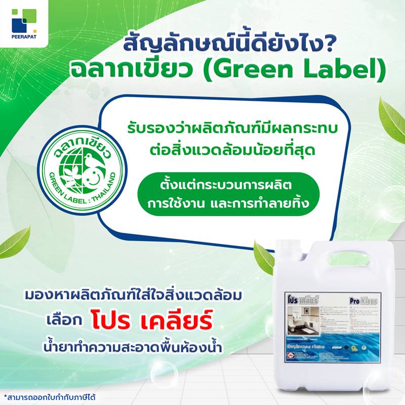 สัญลักษณ์ ฉลากเขียว (Green Label) เป็นเครื่องหมายที่ยืนยันว่า น้ำยาทำความสะอาดพื้นห้องน้ำ โปรเคลียร์