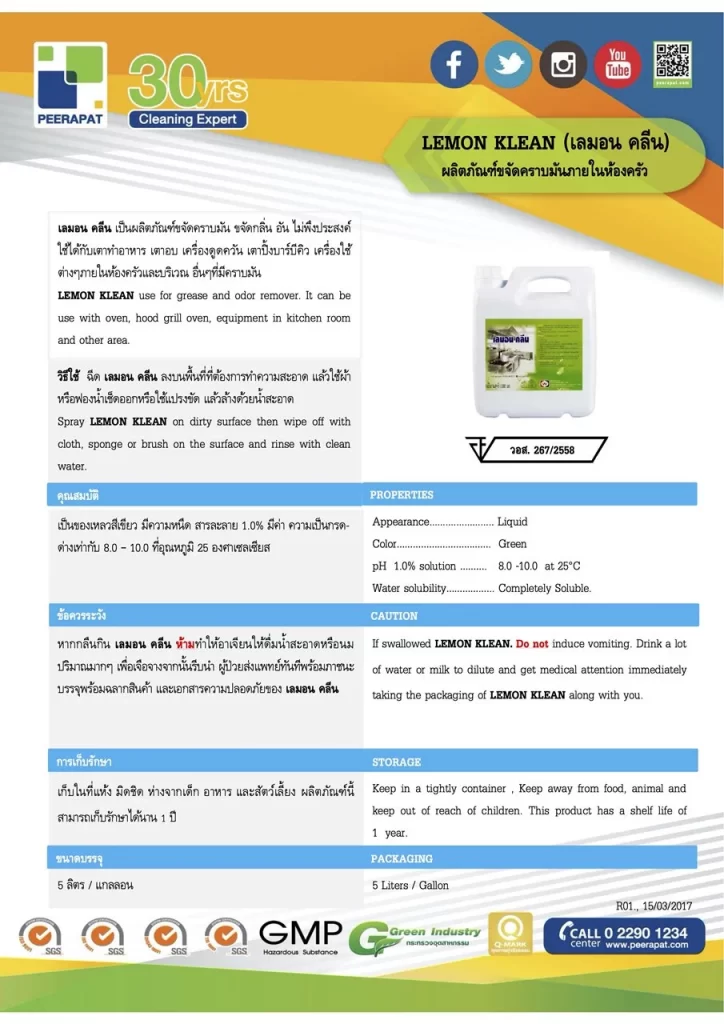 เลมอน คลีน เป็นผลิตภัณฑ์ขจัดคราบมัน ขจัดกลิ่น อันไม่พึงประสงค์ ใช้ได้กับเตาทำอาหาร เตาอบ เครื่องดูดควัน เตาปิ้งบาร์บีคิว เครื่องใช้ต่างๆภายในห้องครัวและบริเวณ อื่นๆที่มีคราบมัน