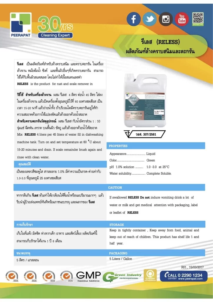 รีเลส เป็นผลิตภัณฑ์สําหรับล้างคราบสนิม และคราบตะกรัน ในเครื่องล้างจาน หม้อต้มนํ้า ซิงค์ และพื้นผิวอื่นๆที่เกิดคราบตะกรัน สามารถใช้ได้กับพื้นผิวสแตสเลส โดยไม่ทําให้เนื้อสแตนเลสดํา