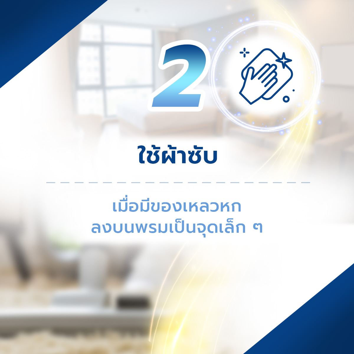 1. เมื่อมีของเหลวหกลงบนพรมเป็นจุดเล็ก ๆ ให้ใช้ผ้าซับ ไม่ควรใช้การเช็ดหรือถูออกเพราะจะทำให้คราบกระจายวงกว้างขึ้น